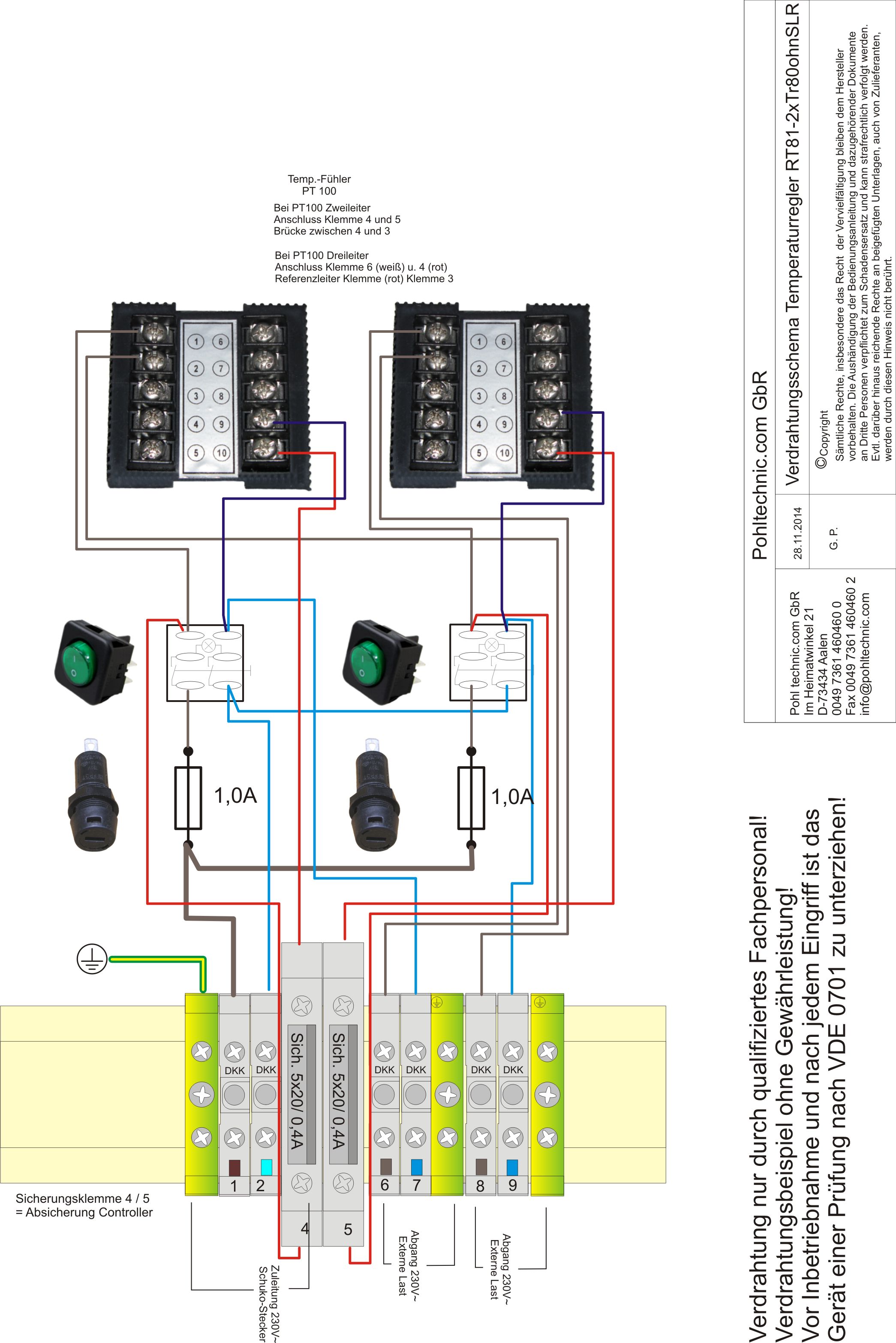 Durch den an der Frontseite Angebrachten Ein-/Aus Schalter wird der Controller komplett vom Stromnetz getrennt. Es wird keine Veränderung von Parametern am Temperaturregler vorgenommen, somit bleiben die eingestellten Werte unberührt. Die Umschaltung kann zu jeder Zeit erfolgen. Absicherung der Steuerspannung durch eine Feinsicherung, zum begrenzen des Ausgangsstroms an den Klemmen ist eine weitere Feinsicherung Verbaut. Alle Sicherungen sind Innenliegend als Reihenklemme ausgeführt.